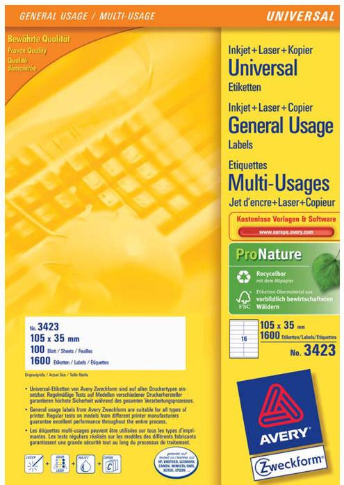 Die Universal-Etiketten von Avery Zweckform sind für alle gängigen Drucker und Kopierer geeignet und garantieren einen staufreien Druckerdurchlauf. Druckerdurchlauf für Laserdrucker getestet und bestätigt durch TÜV. Diese Aufkleber bieten Ihnen für jeden Bedarf und Anwendungsbereich die passende Lösung. Mit den Universal-Etiketten im Format 105 x 35 mm können Sie z.B. Waren auszeichnen. Dank der kostenlosen Avery Zweckform Vorlagen und Software-Lösungen können Sie die Universal-Etiketten schnell und einfach gestalten und drucken!