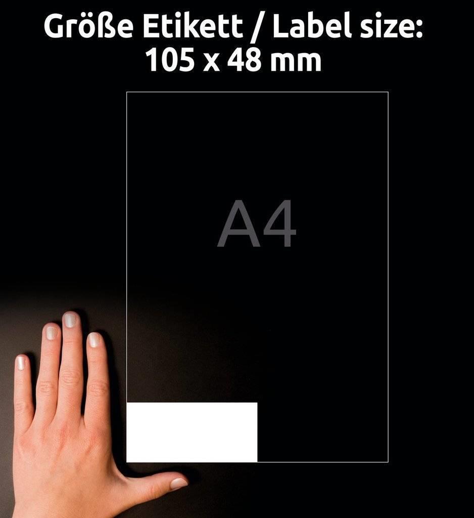 Die Universal-Etiketten von Avery Zweckform sind für alle gängigen Drucker und Kopierer geeignet und garantieren einen staufreien Druckerdurchlauf. Druckerdurchlauf für Laserdrucker getestet und bestätigt durch TÜV. Diese Aufkleber bieten Ihnen für jeden Bedarf und Anwendungsbereich die passende Lösung. Mit den Universal-Etiketten im Format 105 x 48 mm können Sie z.B. Prospekthüllen beschriften. Dank der kostenlosen Avery Zweckform Vorlagen und Software-Lösungen können Sie die Universal-Etiketten schnell und einfach gestalten und drucken!