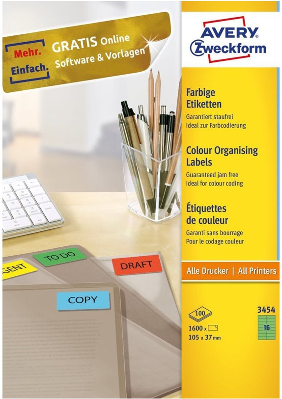 Verwenden Sie farbige Etiketten von Avery Zweckform um die Übersicht über Ihre Unterlagen zu behalten. Mit einer einheitlichen Farbcodierung finden auch Ihre Kollegen schnell den richtigen Ordner. Verwenden Sie beispielsweise blaue Etiketten für die Unterlagen Ihrer Kunden, gelbe für Ihre Lieferanten usw. Die grünen Aufkleber im Format 105 x 37 mm lassen sich mit allen gängigen Druckern und Kopierern bedrucken. Dank der kostenlosen Avery Zweckform Vorlagen und Software-Lösungen können Sie die farbigen Etiketten schnell und einfach gestalten und drucken!