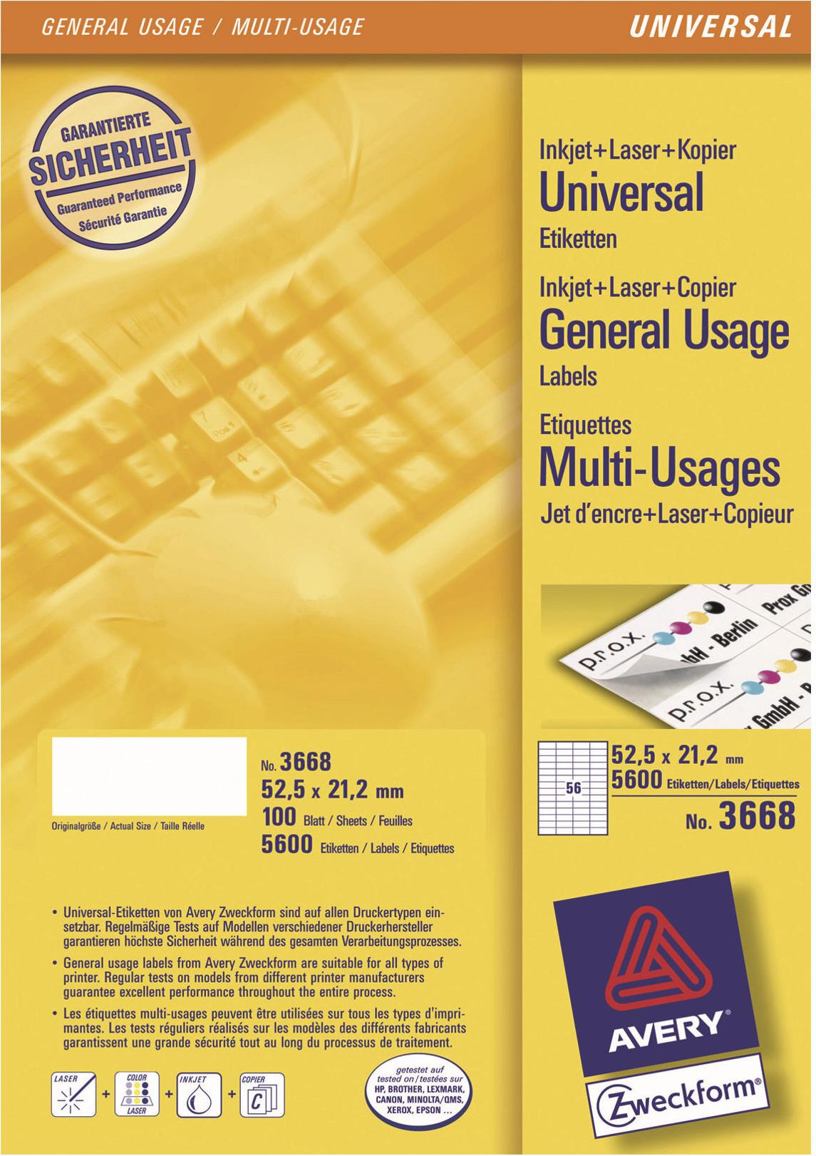 Die Universal-Etiketten von Avery Zweckform sind für alle gängigen Drucker und Kopierer geeignet und garantieren einen staufreien Druckerdurchlauf. Druckerdurchlauf für Laserdrucker getestet und bestätigt durch TÜV. Diese Aufkleber bieten Ihnen für jeden Bedarf und Anwendungsbereich die passende Lösung. Mit den Universal-Etiketten im Format 52,5 x 21,2 mm können Sie z.B. Anmerkungen in Entwürfen vornehmen. Dank der kostenlosen Avery Zweckform Vorlagen und Software-Lösungen können Sie die Universal-Etiketten schnell und einfach gestalten und drucken!