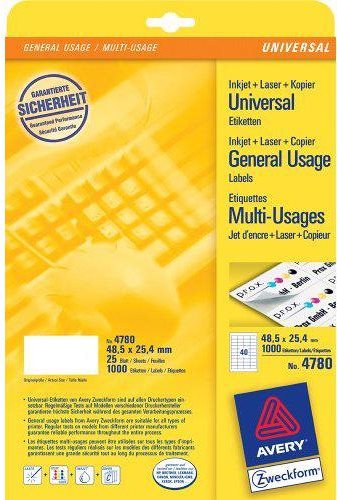 Die Universal-Etiketten von Avery Zweckform sind für alle gängigen Drucker und Kopierer geeignet und garantieren einen staufreien Druckerdurchlauf. Druckerdurchlauf für Laserdrucker getestet und bestätigt durch TÜV. Diese Aufkleber bieten Ihnen für jeden Bedarf und Anwendungsbereich die passende Lösung. Mit den Universal-Etiketten im Format 48,5 x 25,4 mm können Sie z.B. Korrekturen in Entwürfen vornehmen. Dank der kostenlosen Avery Zweckform Vorlagen und Software-Lösungen können Sie die Universal-Etiketten schnell und einfach gestalten und drucken!