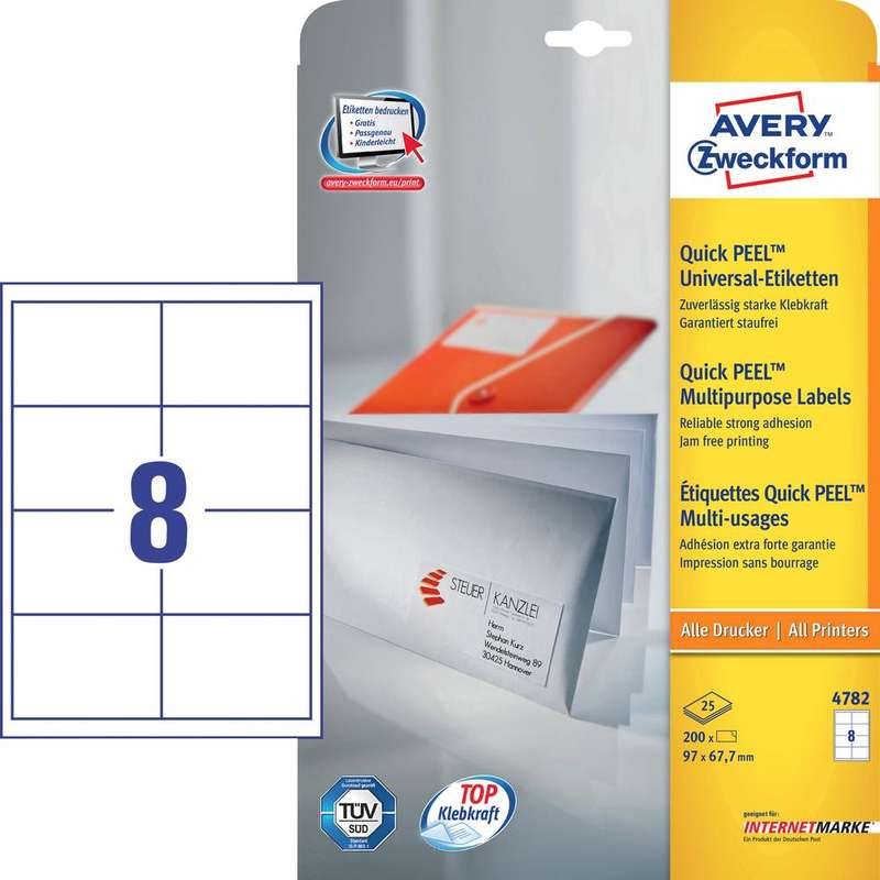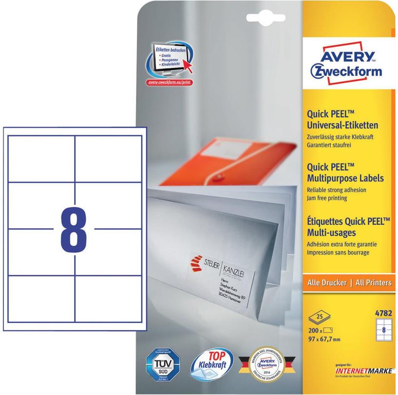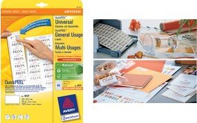 Die Universal-Etiketten von Avery Zweckform sind für alle gängigen Drucker und Kopierer geeignet und garantieren einen staufreien Druckerdurchlauf. Druckerdurchlauf für Laserdrucker getestet und bestätigt durch TÜV. Diese Aufkleber bieten Ihnen für jeden Bedarf und Anwendungsbereich die passende Lösung. Mit den Universal-Etiketten im Format 97 x 67,7 mm können Sie z.B. Mappen beschriften. Dank der kostenlosen Avery Zweckform Vorlagen und Software-Lösungen können Sie die Universal-Etiketten schnell und einfach gestalten und drucken!