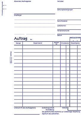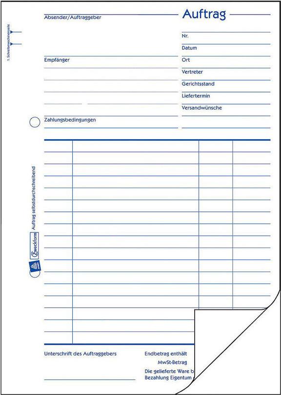 Stellen Sie sicher, dass Sie bei der Vergabe von Aufträgen keine wesentlichen Details übersehen. Die Aufträge von Avery Zweckform bieten Ihnen die Möglichkeit alle nötigen Angaben abzudecken. Der Auftrag im DIN A5 Format beinhaltet 1 Blatt Blaupapier und ist mit Schreibmaschinen gerechtem Zeilenabstand ausgestattet.