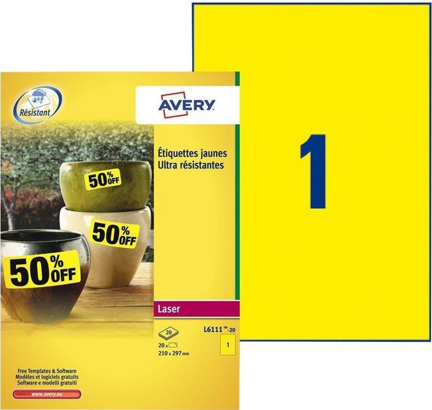 Avery Durable Labels - Polyester-Klebeetiketten - Gelb - A4 (210 x 297 mm) - 20 Etikett(en) (20 Bogen x 1) (L6111-20)