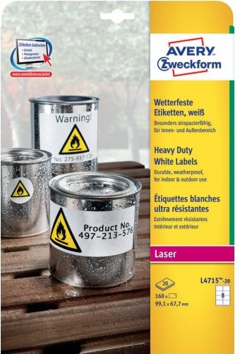 Die weißen, wetterfesten Etiketten L4715-20 für Laserdrucker von AVERY ZWECKFORM zeichnen sich durch eine extreme Strapazierfähigkeit im Innen- und Außenbereich aus. 160 matt beschichtete Polyester-Folienetiketten auf 20 Bogen. Durch die starke, permanente Haftung eigenen sie sich besonders zur wetterfesten und dauerhaften Kennzeichnung. Die reiß- und wasserfesten Folienetiketten sind deutlich strapazierfähiger als Papier-Etiketten, öl-, schmutz-, UV- und temperaturbeständig (-20 °C bis +80 °C).