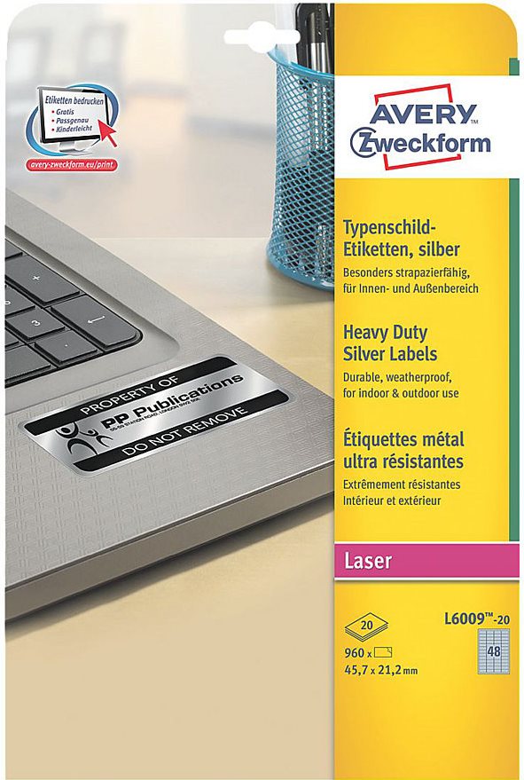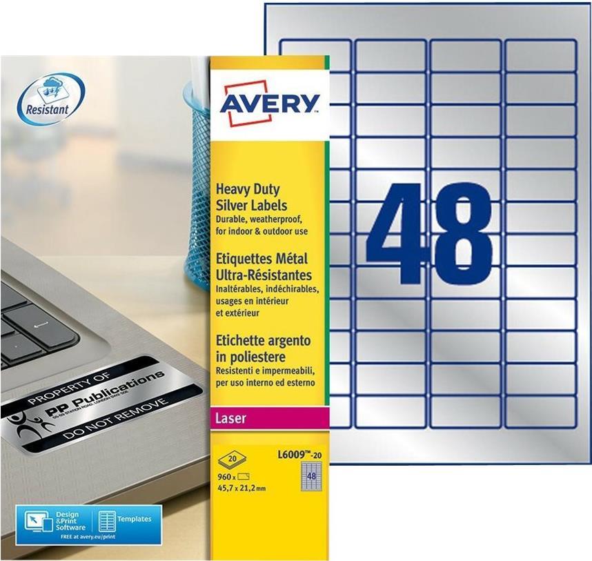 Avery Heavy Duty Laser Labels - Polyesteretiketten - Silber - 45,7 x 21,2 mm - 960 Etikett(en) (20 Bogen x 48) - (L6009-20)