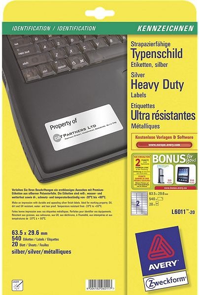 Avery Heavy Duty Laser Labels L6011 - Polyesteretiketten - Silber - 29,6 x 63,5 mm 540 Stck. (20 Bogen x 27) (L6011-20)