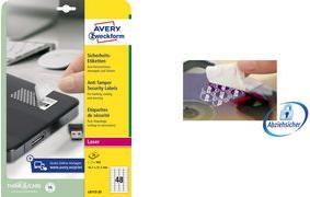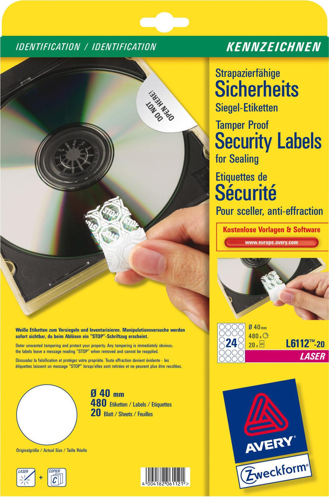 Schützen Sie hochwertige Geräte und Produkte Ihrer Firma! Dank der Sicherheits-Etiketten von Avery Zweckform werden Manipulationsversuche sofort sichtbar. Die Folienetiketten mit Durchmesser von 40 mm hinterlassen beim Abziehen einen STOP-Schriftzug und können nicht wieder aufgeklebt werden. So sichern Sie Ihr Eigentum vor fremden Eingriffen. Dank der kostenlosen Avery Zweckform Vorlagen und Software-Lösungen können Sie die Sicherheits-Etiketten schnell und einfach gestalten und drucken!