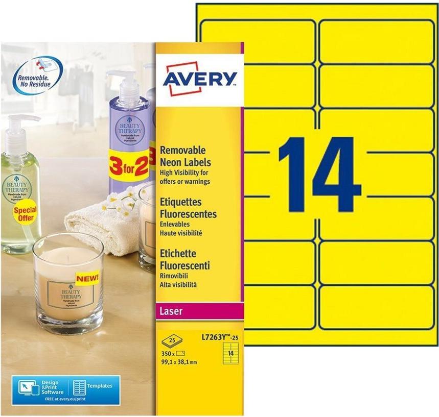 Avery High Visibility Labels - Permanentklebeetiketten - Neongelb - 99,1 x 38,1 mm - 350 Etikett(en) (25 Bogen x 14) (L7263Y-25)