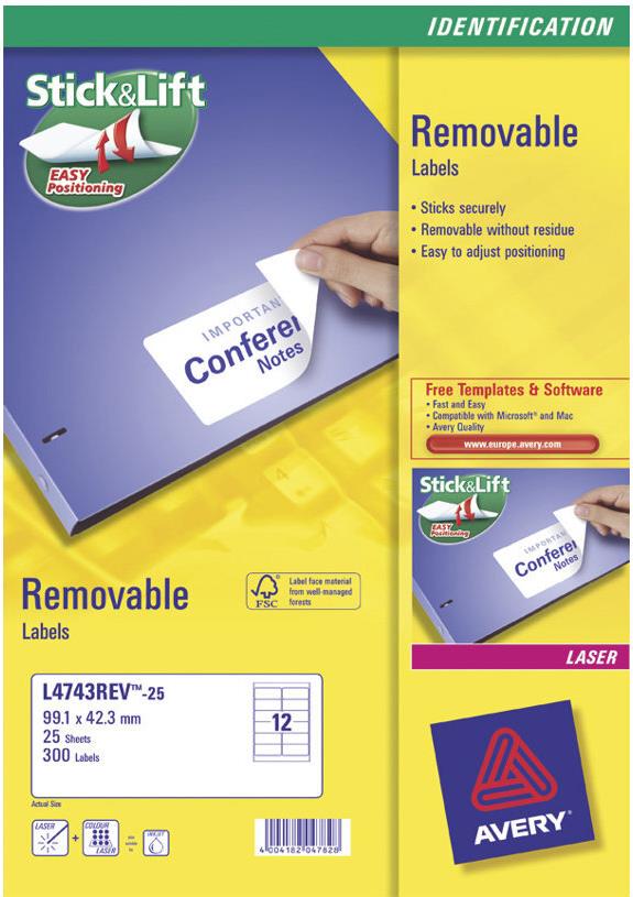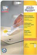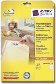 Die wiederablösbaren Universal-Etiketten von Avery Zweckform lassen sich mit allen gängigen Druckern und Kopierern bedrucken und garantieren einen staufreien Druckerdurchlauf. Druckerdurchlauf für Laserdrucker getestet und bestätigt durch TÜV. Diese Aufkleber bieten Ihnen für jeden Bedarf und Anwendungsbereich die passende Lösung und sind rückstandsfrei wiederablösbar. Mit den wiederablösbaren Universal-Etiketten können Sie z.B. Diakästen beschriften. Dank der kostenlosen Avery Zweckform Vorlagen und Software-Lösungen können Sie die wiederablösbaren Universal-Etiketten schnell und einfach gestalten und drucken!