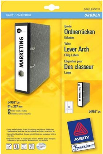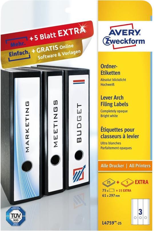 Avery L4759 - Aktenetiketten - weiß - 61 x 297 mm 75 Stck. (25 Bogen x 3) (L4759-25)