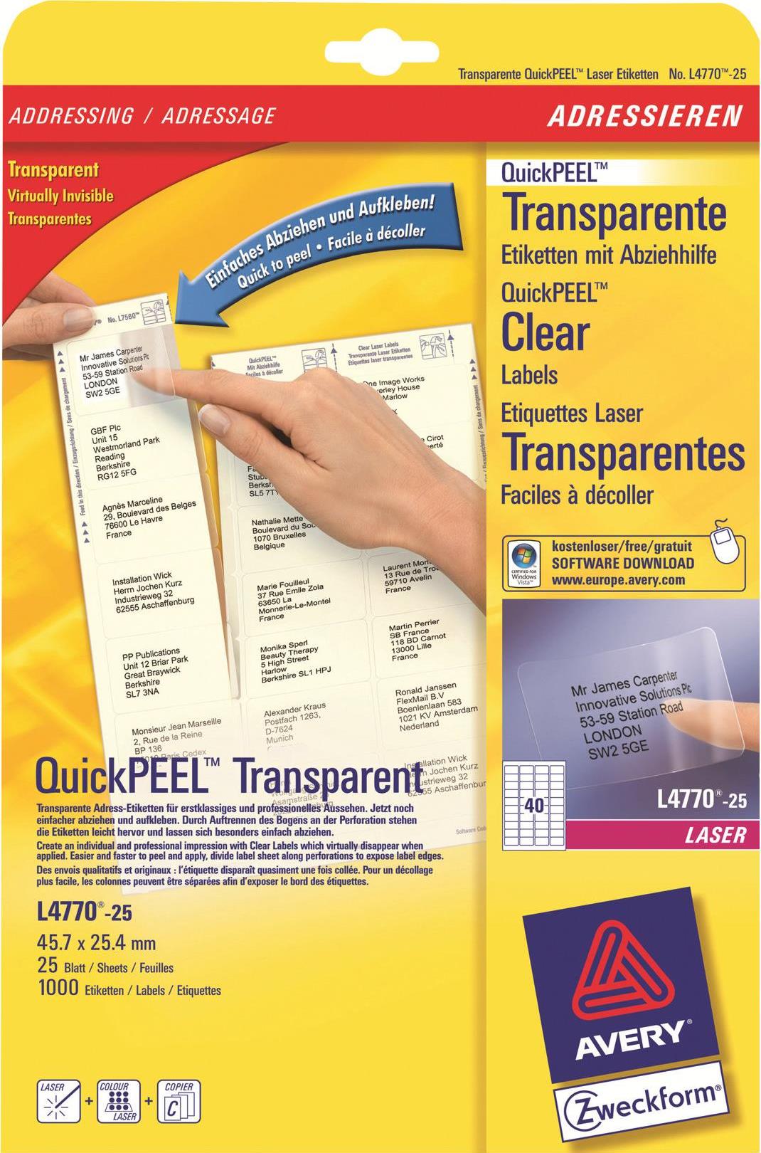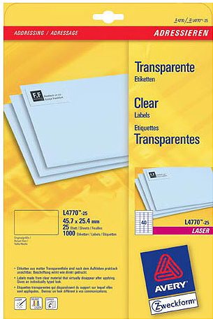 Avery L4770 - Transparente Adressenetiketten - 25,4 x 45,7 mm - 1000 Stck. (25 Bogen x 40) (L4770-25)