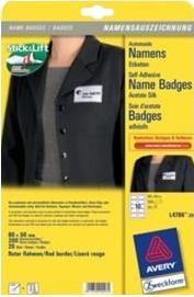 Erleichtern Sie sich die Organisation von Veranstaltungen, Seminaren und Konferenzen. Mit Namens-Etiketten von Avery Zweckform erkennt man sein Gegenüber sofort. Die Namens-Schilder haften zuverlässig auf Kleidung und lassen sich rückstandsfrei wieder ablösen. Die Namens-Etiketten im Format 80 x 50 mm bieten einen garantiert staufreien Druckerdurchlauf auf allen gängigen Laserdruckern. Gestalten und bedrucken Sie die Namens-Etiketten schnell und einfach mit den kostenlosen Vorlagen und der Software von Avery Zweckform.