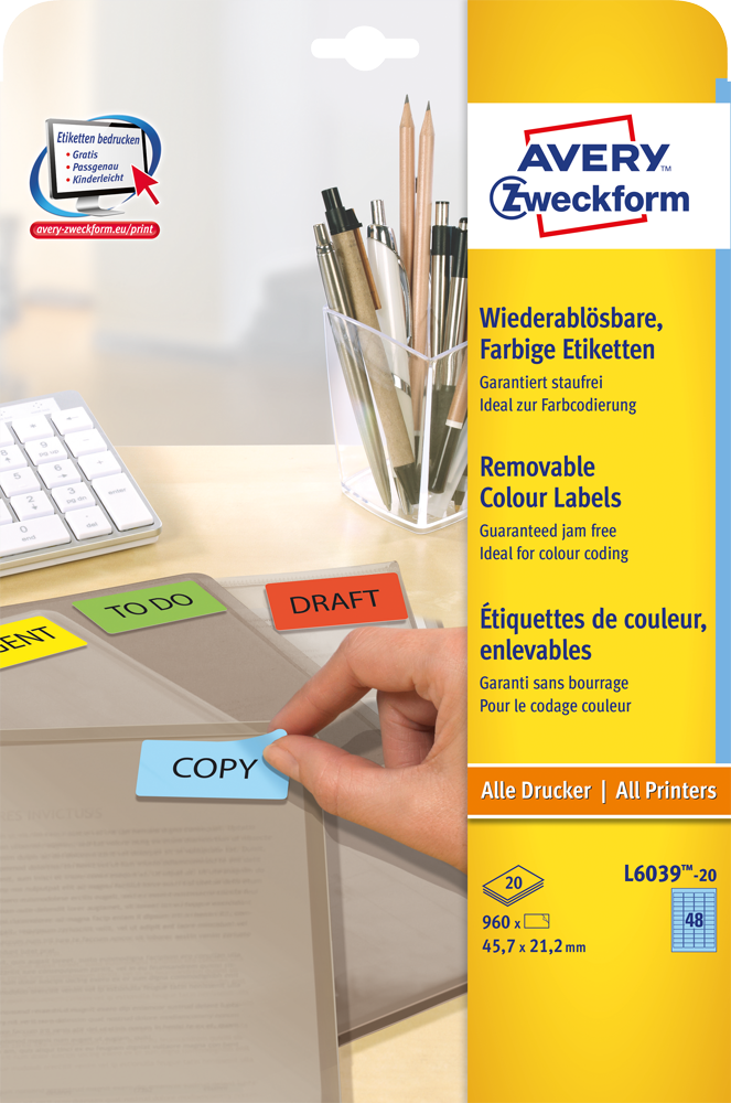 Farbige Etiketten von Avery Zweckform helfen Ihnen dabei den Überblick über Ihre Unterlagen zu behalten. Erstellen Sie mit den Aufklebern eine einheitliche Farbcodierung. So finden Sie und Ihre Kollegen sofort die gesuchten Unterlagen. Die blauen, wiederablösbaren Etiketten im Format 45,7 x 21,2 mm lassen sich mit allen gängigen Druckern und Kopierern bedrucken. Perfekt für temporäre Beschriftungen geeignet. Dank der kostenlosen Avery Zweckform Vorlagen und Software-Lösungen können Sie die farbigen Etiketten schnell und einfach gestalten und drucken!