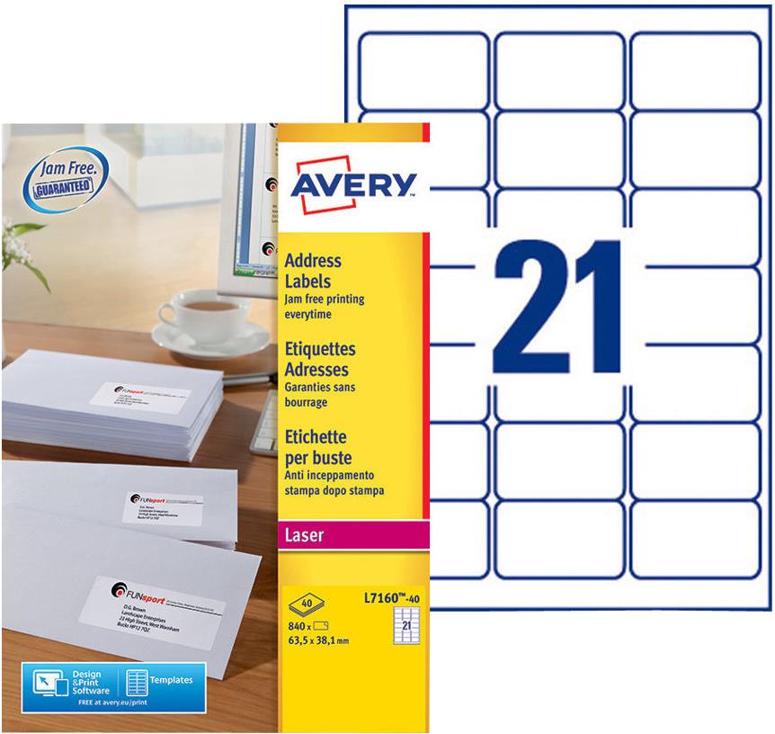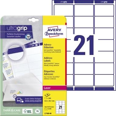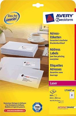 Avery - Adressetiketten - weiß - 63,5 x 38,1 mm - 840 Etikett(en) (40 Bogen x 21) (L7160-40)
