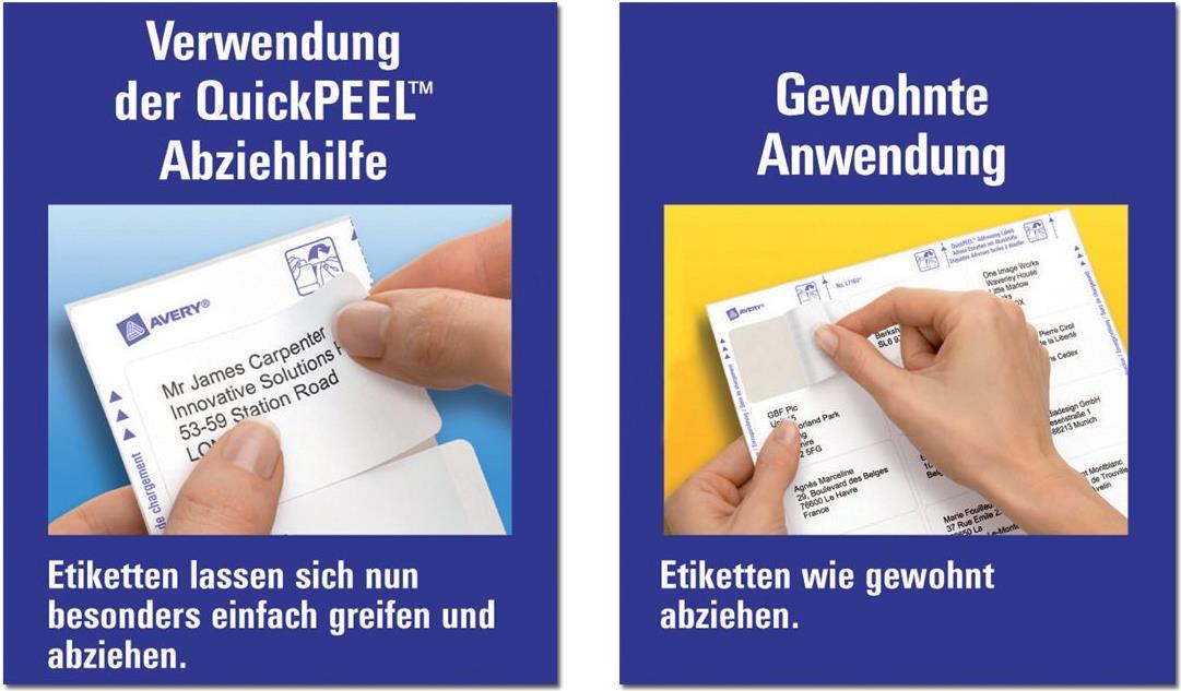Die blickdichten Versand-Etiketten von Avery Zweckform sind die perfekte Wahl wenn Sie z.B. B4/C4 Umschläge nutzen. Diese Versand-Etiketten im Format 99,1 x 67,7 mm decken alte Beschriftungen ab. So können Sie bei Bedarf Verpackungen erneut verwenden. Dank INTERNETMARKE können Sie Ihr Porto und Empfängeradresse direkt auf die Versand-Etiketten von Avery Zweckform drucken. Die Etiketten haben einen garantiert staufreien Druckerdurchlauf. Druckerdurchlauf für Laserdrucker getestet und bestätigt durch TÜV.