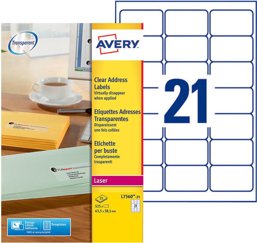 Geben Sie Ihren Aussendungen eine professionelle Note. Transparente Adress-Etiketten von Avery Zweckform helfen Ihnen dabei! Die Folienetiketten im Format 63,5 x 38,1 mm sind nach dem Aufkleben nahezu unsichtbar. Ihre Absenderadresse sieht aus als wäre sie direkt aufgedruckt. So kommt die Farbe des C6 Umschlags zur vollen Geltung. Für Laser- und Farblaser-Drucker geeignet. Dank der kostenlosen Avery Zweckform Vorlagen und Software-Lösungen können Sie die transparenten Adressetiketten schnell und einfach gestalten und drucken!