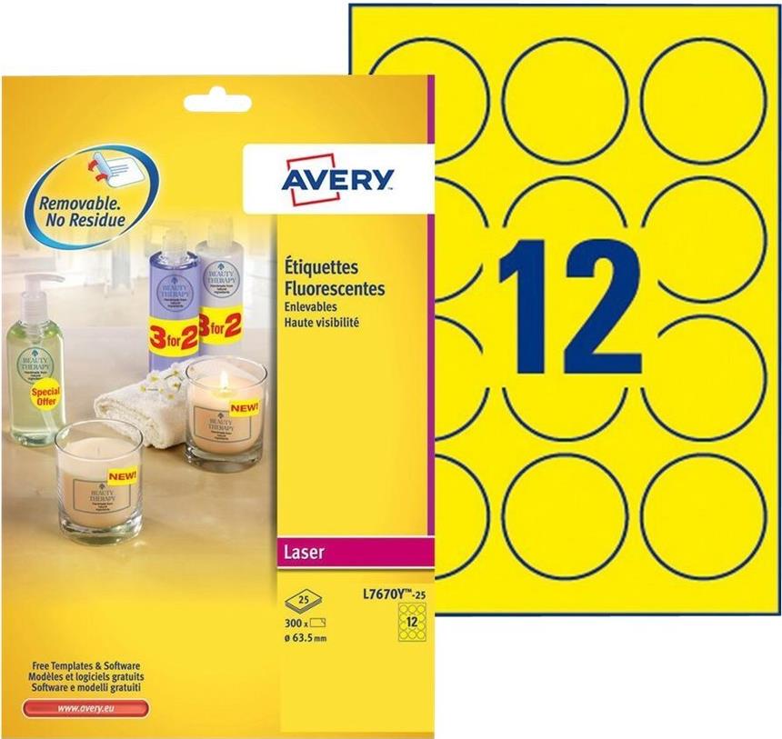 Avery L7670Y - Neongelb - 63,5 mm (rund) 300 Etikett(en) (25 Bogen x 12) runde Etiketten