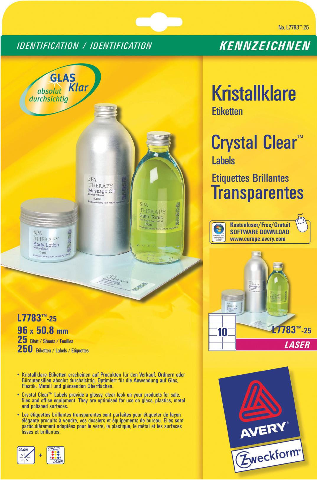 Gestalten Sie eine hochwertige Warenpräsentation mit den kristallklaren Etiketten von Avery Zweckform. Die transparenten Etiketten im Format 96 x 50,8 mm eignen sich hervorragend für Produktinformationen auf Glas, Plastik und anderen glänzenden Oberflächen. Die Beschriftung wirkt wie direkt bedruckt. Dank der kostenlosen Avery Zweckform Vorlagen und Software-Lösungen können Sie die kristallklaren Etiketten schnell und einfach gestalten und drucken!