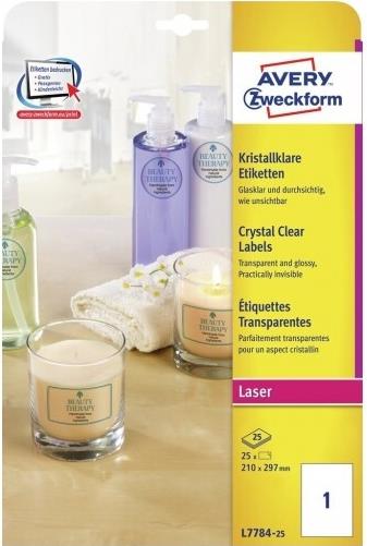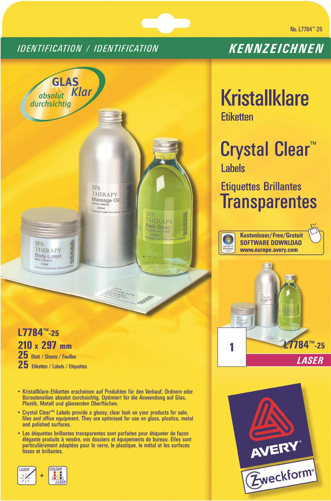 Avery L7784 - Permanent selbstklebende Polyesteretiketten, glänzend - klar - A4 (210 x 297 mm) - 25 Etikett(en) (25 Bogen x 1) (L7784-25)