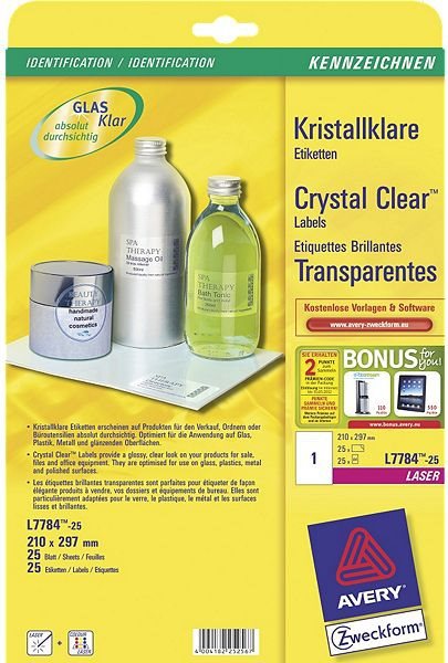 Gestalten Sie eine hochwertige Warenpräsentation mit den kristallklaren Etiketten von Avery Zweckform. Die transparenten Etiketten im Format 210 x 297 mm eignen sich hervorragend für Produktinformationen auf Glas, Plastik und anderen glänzenden Oberflächen. Die Beschriftung wirkt wie direkt bedruckt. Dank der kostenlosen Avery Zweckform Vorlagen und Software-Lösungen können Sie die kristallklaren Etiketten schnell und einfach gestalten und drucken!