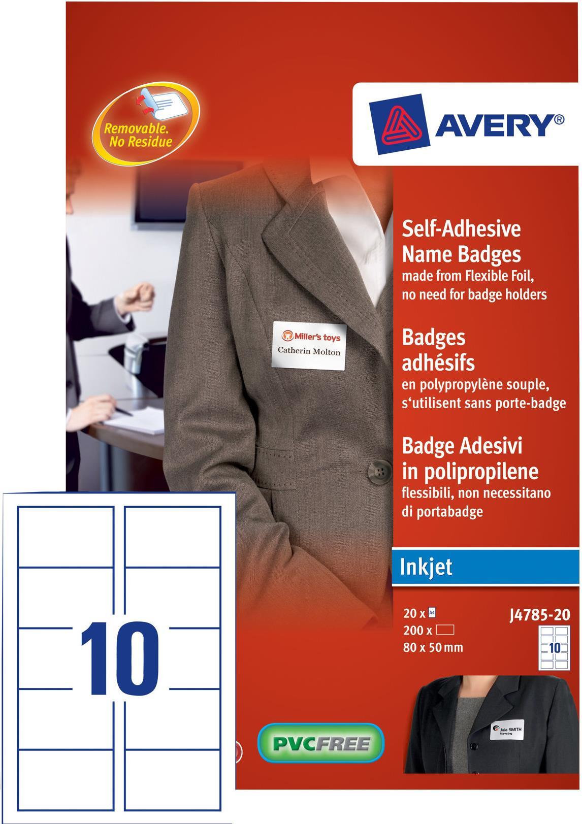 Avery Name Badge - Polypropylene name badge labels - weiß - 50 x 80 mm - 200 Stck. (20 Bogen x 10) - (J4785-20)