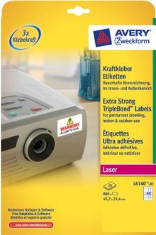 Die Kraftkleber-Etiketten von Avery Zweckform kleben dreimal stärker als herkömmliche Etiketten. Mit den Folienetiketten im Format 45,7 x 25,4 mm stellen Sie sicher, dass auch gesetzlich relevante Produktinformationen nicht verloren gehen. Sie sind besonders strapazierfähig und eignen sich ideal für dauerhafte Produkt- und Eigentumskennzeichnung. Dank der kostenlosen Avery Zweckform Vorlagen und Software-Lösungen können Sie die Kraftkleber-Etiketten schnell und einfach gestalten und drucken!