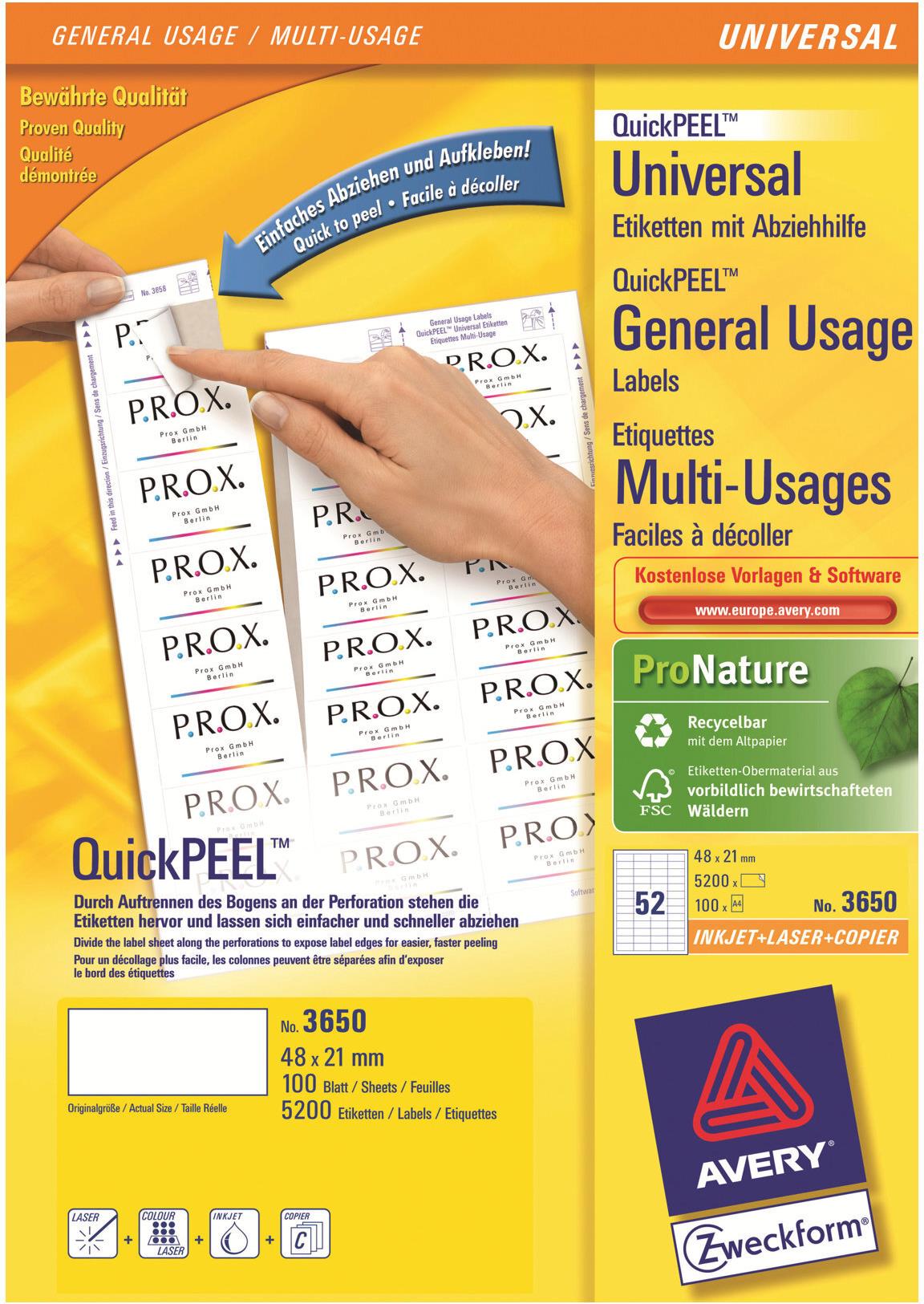 AVERY Zweckform Universal-Etiketten, 48,0 x 21,0 mm, weiß Rand rundum, QuickPEEL Technologie, FSC zertifiziert für Inkjet-, Laser-, Farblaserdrucker und Kopierer Inhalt: 5.200 Etiketten auf 100 Blatt A4 (3650)