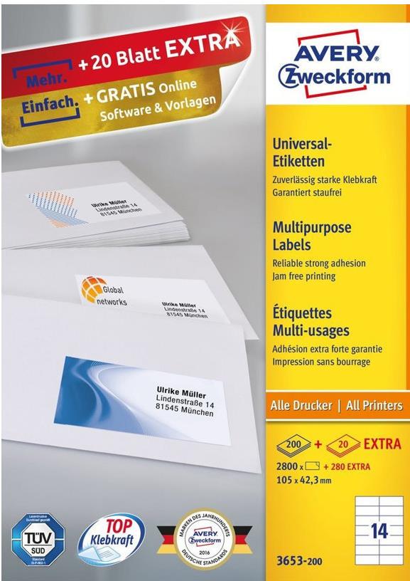 Bedrucken Sie die Universal-Etiketten von Avery Zweckform mit allen gängigen Druckern und Kopierern. Die Etiketten garantieren einen staufreien Druckerdurchlauf. Druckerdurchlauf für Laserdrucker getestet und bestätigt durch TÜV. Diese Aufkleber bieten Ihnen für jeden Bedarf und Anwendungsbereich die passende Lösung. Mit den Universal-Etiketten im Format 105 x 42,3 mm können Sie z.B. Inhaltsangaben erstellen. Dank der kostenlosen Avery Zweckform Vorlagen und Software-Lösungen können Sie die Universal-Etiketten schnell und einfach gestalten und drucken!