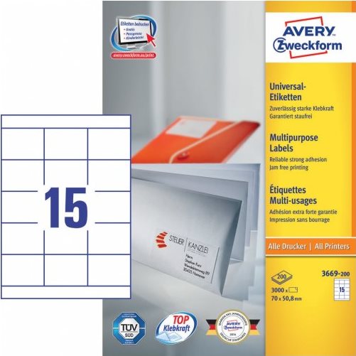 Bedrucken Sie die Universal-Etiketten von Avery Zweckform mit allen gängigen Druckern und Kopierern. Die Etiketten garantieren einen staufreien Druckerdurchlauf. Druckerdurchlauf für Laserdrucker getestet und bestätigt durch TÜV. Diese Aufkleber bieten Ihnen für jeden Bedarf und Anwendungsbereich die passende Lösung. Mit den Universal-Etiketten im Format 70 x 50,8 mm können Sie z.B. Buchetiketten erstellen. Dank der kostenlosen Avery Zweckform Vorlagen und Software-Lösungen können Sie die Universal-Etiketten schnell und einfach gestalten und drucken!