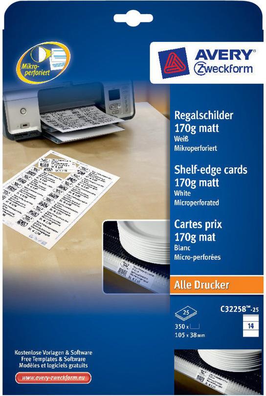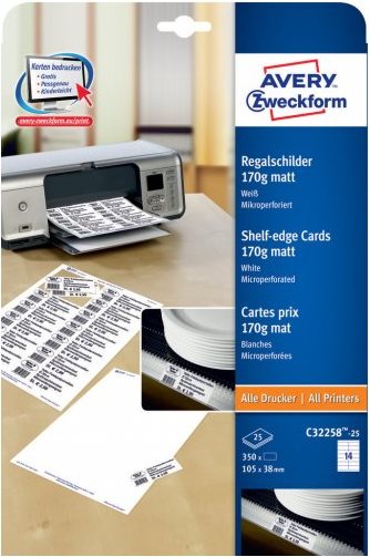Avery Zweckform C32258-25 - Karten - matte - perforated - Mattes Weiß - 105 x 38 mm - 170 g/m² - 350 Karte(n) (25 Bogen x 14)