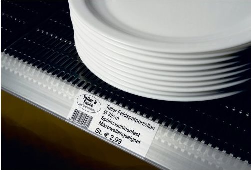 Bedruckte Regalschilder für Preis- und Scannerleisten sind meistens sehr umständlich zu beschaffen. Drucken Sie Ihre Regalschilder in Zukunft einfach selbst. Legen Sie fest wo Sie Produktname, Barcode, Preis und weitere Informationen platzieren wollen. Fügen Sie außerdem noch Ihr Firmenlogo ein. Nun müssen Sie nur noch die entsprechenden Informationen eingeben - ausdrucken - fertig!
