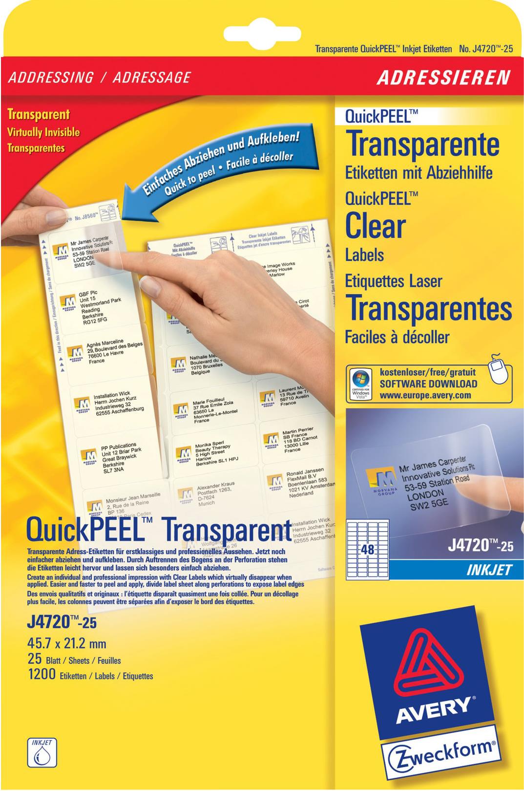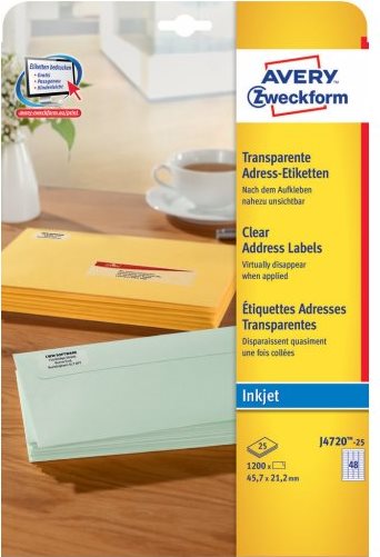 Avery Zweckform J4720 - Polyester-Klebeetiketten - klar - 21,2 x 45,7 mm - 1200 Etikett(en) (25 Bogen x 48) (J4720-25)