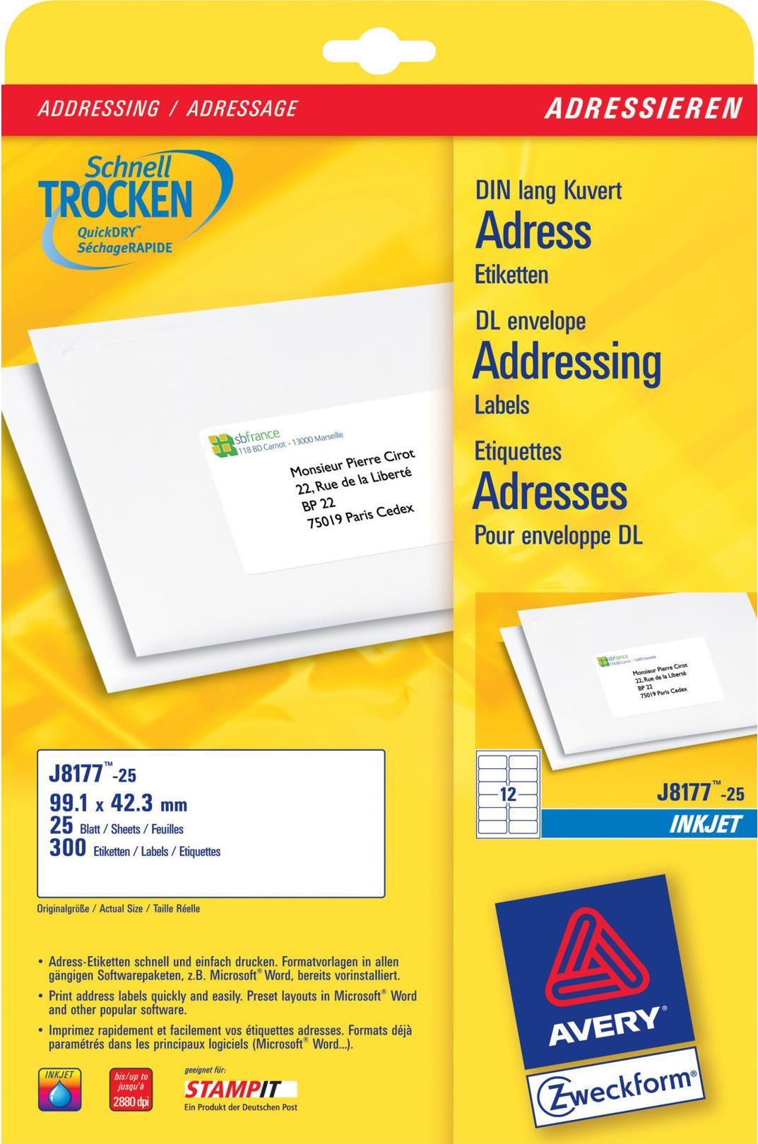 Avery Zweckform J8177 - Adressetiketten - weiß - 42,3 x 99,1 mm - 300 Etikett(en) (25 Bogen x 12) (J8177-25)