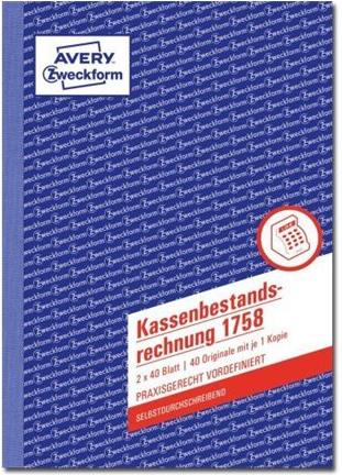 Erfassen Sie taggenau alle Zahlungsvorgänge mit der Kassenbestandsrechnung von Avery Zweckform. Das Formular im DIN A5 Format hilft Ihnen bei der rechnerischen Ermittlung der Tageseinnahmen und des Kassenbestands am Ende des Tages. Die Kassenbestandsrechnung beinhaltet ein Original und einen gelben Durchschlag und ist selbstdurchschreibend. Die Kassenformulare von Avery Zweckform werden regelmäßig von Rechtsexperten überprüft und aktualisiert.