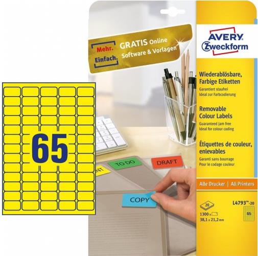 Avery Zweckform - Entfernbarer Klebstoff - Gelb - 38.1 x 21.2 mm 1300 Etikett(en) (20 Bogen x 65) Etiketten