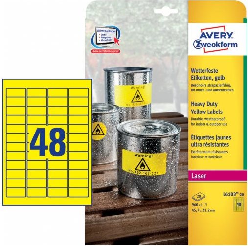 Avery Zweckform L6103 - Wasserbeständige permanente Polyester-Klebeetiketten - Gelb - 45,7 x 21,2 mm - 960 Etikett(en) (20 Bogen x 48) (L6103-20)