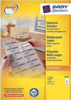 Die Universal-Etiketten von Avery Zweckform sind für alle gängigen Drucker und Kopierer geeignet und garantieren einen staufreien Druckerdurchlauf. Druckerdurchlauf für Laserdrucker getestet und bestätigt durch TÜV. Diese Aufkleber bieten Ihnen für jeden Bedarf und Anwendungsbereich die passende Lösung. Mit den Universal-Etiketten im Format 97 x 55 mm können Sie z.B. Schubladen und Fächer beschriften. Dank der kostenlosen Avery Zweckform Vorlagen und Software-Lösungen können Sie die Universal-Etiketten schnell und einfach gestalten und drucken!