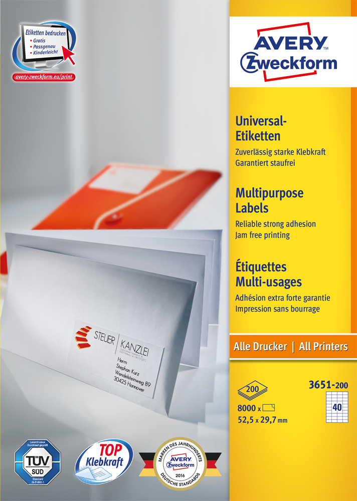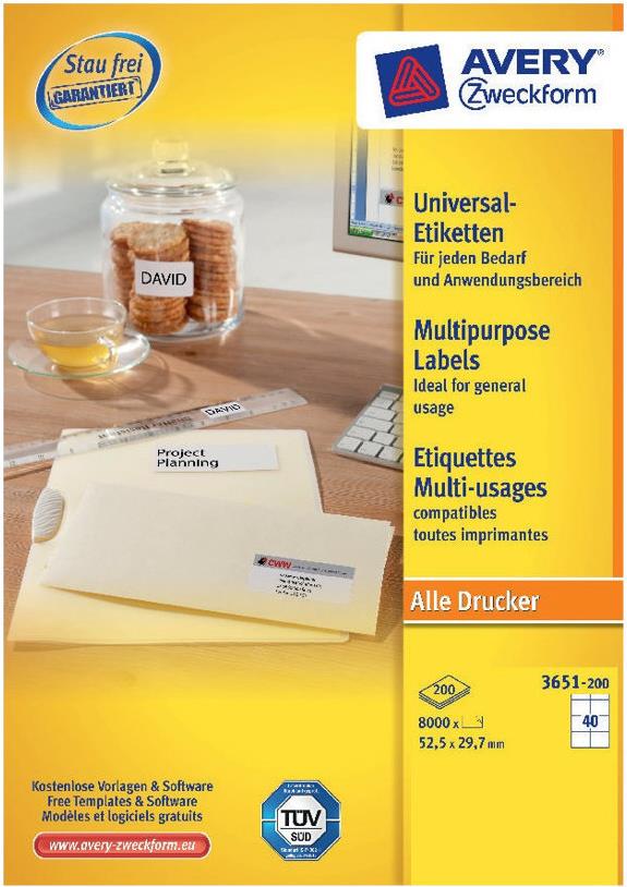 Bedrucken Sie die Universal-Etiketten von Avery Zweckform mit allen gängigen Druckern und Kopierern. Die Etiketten garantieren einen staufreien Druckerdurchlauf. Druckerdurchlauf für Laserdrucker getestet und bestätigt durch TÜV. Diese Aufkleber bieten Ihnen für jeden Bedarf und Anwendungsbereich die passende Lösung. Mit den Universal-Etiketten im Format 52,5 x 29,7 mm können Sie z.B. Eigentum kennzeichnen. Dank der kostenlosen Avery Zweckform Vorlagen und Software-Lösungen können Sie die Universal-Etiketten schnell und einfach gestalten und drucken!