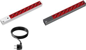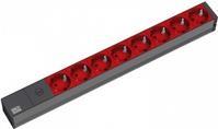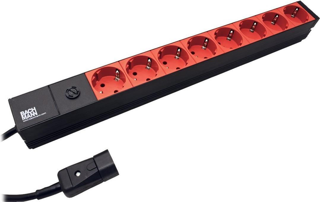 Bachmann 48,30cm (19")-Steckdosenleiste ALU, 8-fach, für USV mit IEC-Kaltgerätestecker IEC320 C14 (für USV-Anlagen), Zuleitung 2 m, 1HE, schwarz, 8 rote Schutzkontakt-Steckdosen, ohne Schalter; Mit 10 A Feinsicherung (333.538)