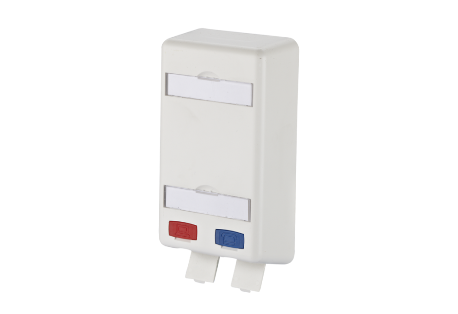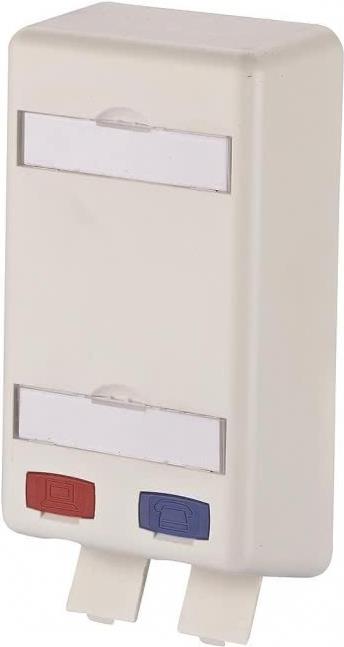 flaches Aufputzgehäuse für zwei Einzelmodule in Modulbauform (E-DAT modul, C6Amodul) mit Sichtfenster für Beschriftungseinlage (Beschriftungseinlagen im Lieferumfang enthalten) zum Einbau in Unterflur-Zwischenböden geeignet farbige Kodierung der Ports (rot/blau) ideal zur Realisierung von Consolidation Points