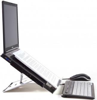 Der Ergo-Q 260 lässt sich problemlos mit nur zwei Handgriffen auseinanderklappen und aufstellen. Dazu einfach das runde Verbindungsstück in eine der fünf Perforierungen stecken. Der integrierte Dokumentenhalter wird mühelos nach vorne geklappt, sodass Sie Ihren Laptop auf die Schaumstoffpolster heben können. Die stabile Standfläche und die Anti-Rutschfüße auf der Unterseite, versprechen auf jedem Untergrund ein festes Arbeits-Setup für Ihren Laptop.