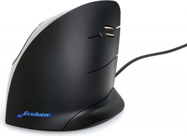 Die Evoluent C Wired unterstützt Ihre Hand in einer aufrechten, neutralen Haltung, die ein Verdrehen des Unterarms verhindert. Die Evoluent C Wired verfügt über zahlreiche Funktionen wie fünf programmierbare Tasten, eine direkt erreichbare DPI-Taste, mit der Sie die Zeigergeschwindigkeit auf einen der vier verschiedenen Werte (500-1000-1500-2000) einstellen können, ein beleuchtetes Evoluent-Logo, das sich ausschaltet, wenn sich das System im Energiesparmodus befindet, und eine Lippe, die den kleinen Finger unterstützt. Die vertikale Form ist noch angenehmer zu greifen, liegt perfekt in der Hand und garantiert höchsten Komfort bei der Arbeit am Computer.