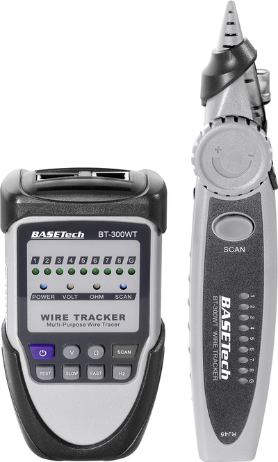 Basetech BT-300 WT Leitungssucher Leitungssucher und Kabeltester BT-300 WTLeitungssucher, Kabeltester und Taschenlampe in EinemSchneller Test von RJ11-, RJ45-Leitungen und offenen AderpaarenOptisch-/Akustische AnzeigeKopfhörera
