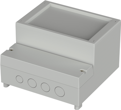 Das Gehäuse mit eingespritzten Nuten für den Karteneinschub senkrecht und waagerecht, Montagenocken und im Klemmraum Anschraubpunkte für Tragschienen. Aufhängung für Wandmontage ...