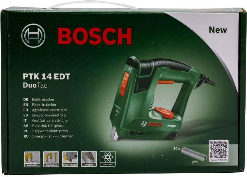 Dieser vielseitige Tacker ist komfortabel und äußerst anpassungsfähig. Er macht Befestigungsarbeiten unglaublich einfach. Mit dem DuoTac-Schalter kann leicht zwischen einer Auslösung mit einer oder zwei Klammern umgeschaltet werden, um die Anforderungen jedes einzelnen Projekts zu erfüllen. Die Electronic Impact Force Selection sorgt für die perfekte Schlagkraft passend zum Material. Das Push + Release System erhöht sowohl die Sicherheit als auch die Kontrolle, indem es eine Selbstauslösung verhindert. Der PTK 14 EDT eignet sich ideal zur Befestigung von weichen, dünnen Materialien auf Holz. Dank der Füllstandsanzeige im Magazin muss man sich nicht länger ärgern, dass Klammern oder Nägel unerwartet ausgehen.Produkttext[/head]Zentrale ProduktmerkmaleDuoTac - Wahlweise Verarbeitung von 2 Klammern für höhere ReißfestigkeitElektronische Schlagkrafteinstellung für optimales Arbeitsergebnis beim Einsatz von unterschiedlichen Klammerlängen und MaterialartenSoftgrip für sichere und komfortable HandhabungWeitere ProduktvorteileEinfach zu bedienendes Push + Release System für kontrollierte Schlagauslösung: Tackernase auf das Werkstück drücken und Schalter betätigenEinfach zu bestückendes Klammermagazin mit NachfüllanzeigeVielseitig einsetzbar - mit Klammern und Nägeln - beim Befestigen von dünnen Materialien auf HolzProfessionell, präzise, praktisch Der DuoTac-Umschalter für die Wahl zwischen Einzel- und Doppelklammer, die Möglichkeit, sowohl Klammern als auch Nägel zu verwenden und die stufenlose Schlagkrafteinstellung: Die Vorteile des Elektrotackers PTK 14 EDT von Bosch sind beeindruckend. Zusätzliche Features sind die Schlagzahl von bis zu 30 Schlägen pro Minute, das sichere Handling durch Softgrip und das praktische Sichtfenster, um jederzeit den Klammerfüllstand im Blick zu haben. Damit ist der PTK 14 EDT ein nützlicher Helfer - beim Befestigen des Kaninchenzauns ebenso wie beim Anbringen von Dämmfolie. Auch für die Montage der Dachpappe auf Ihrem Gartenhäuschen eignet sich der Bosch PTK 14 EDT ideal, denn dank der flachen Tackernase können Sie auch randnah und in Ecken präzise arbeiten. Einfach und sicher tackern Die einfache Bedienung macht den Bosch PTK 14 EDT bei zahlreichen Projekten zu einem effizienten Werkzeug für Heimwerker. Die ergonomische Softgrip-Griffzone sorgt für eine sichere und bequeme Handhabung des Tackers. Das Push+Release-System verhindert die Selbstauslösung. Erst wenn die Tackernase auf den Werkgegenstand gedrückt wird, kann getackert werden. Praktisch ist auch die Füllstandsanzeige des Magazins. Man sieht damit auf einen Blick, wann das Magazin neu zu befüllen ist und dank des Bottom Loading Magazins geht das in Windeseile: Einfach das Werkzeug umdrehen, Magazin öffnen und mit Klammern oder Nägeln befüllen, fertig! Schlagkräftige Unterstützung für Ihr Projekt Profis überzeugt seine Performance, Heimwerker schätzen die einfache und sichere Bedienung: Der Bosch PTK 14 EDT befestigt schnell und zuverlässig Stoffe, Holz, Folien, Karton oder Leder auf Holz. Egal, ob Sie für Ihr Projekt schmale Fein- oder breite Flachdrahtklammern benötigen - Sie können alles mit nur einem Klammertyp erledigen. Denn die DuoTac-Umschaltfunktion ermöglicht wahlweise die Schlagauslösung mit einer oder gleich zwei Feindrahtklammern. Durch die doppelte Klammerbreite erhöht sich die Reißfestigkeit von dünnen Materialien wie etwa Folien. Mithilfe der stufenlosen Schlagkrafteinstellung und der Möglichkeit, sowohl Klammern als auch Nägel zu verwenden, kann der Tacker an verschiedenste Aufgaben angepasst werden. Damit ist der Bosch Elektrotacker immer der richtige Partner. Der Profi für jeden Befestigungsjob rund ums Haus Durch seine Leistungsfähigkeit, die einfache Handhabung sowie die zahlreichen Einstellmöglichkeiten eignet sich der PTK 14 EDT für die verschiedensten Anwendungen: Sie bauen Ihr Dach aus und müssen Dämmfolie anbringen? Kein Problem. Die Rückwand am neuen Kleiderschrank muss fachmännisch befestigt werden? Mit dem PTK 14 EDT ist das im Handumdrehen erledigt. Im Haus hilft der Tacker bei zahlreichen Kleinigkeiten. Beziehen Sie den alten Stuhl mit einem neuen Polster, ziehen Sie eine Leinwand auf einen Rahmen oder befestigen Sie das Rosengitter im Garten. Mit dem Elektrotacker von Bosch erledigen Sie diese Arbeiten sicher und schnell.[head]Hauptmerkmale
