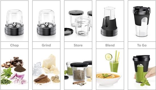 Kompaktes und vielseitiges Multi-Zerkleinerer-Set mit durchdachter 5-in-1 Funktionalität: Kräuter-/Gewürzmühle, Universalzerkleinerer und Mixer mit praktischer Aufbewahrungs- und ToGo-Lösung.