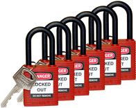 • Brady, Nylon-Sicherheitsschloss mit Nylonbügel, Rot, 38mm Bügelhöhe, 6,5mm Bügeldurchmesser (Keyed Different) ( 6er Pack) (813594)