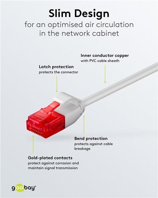 Das SLIM Netzwerkkabel dient zur Verbindung verschiedener Netzwerkgeräte, wie z. B. von einem Notebook an einen Switch. Durch den geringen Kabeldurchmesser ist das Kabel platzsparend zu transportieren und zu verwenden.