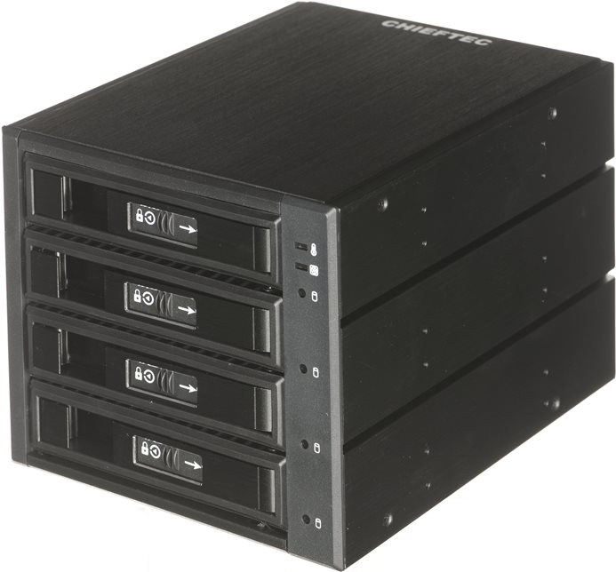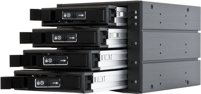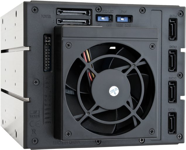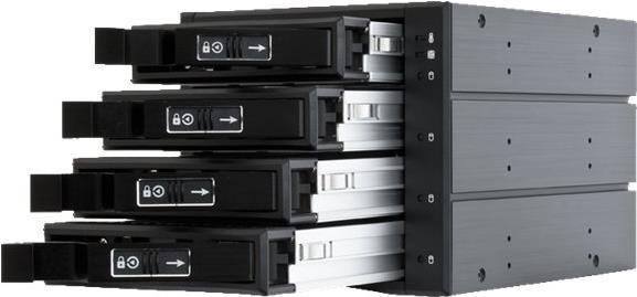 Mit dem patentierten Anti-Vibrationsdesign setzt die hohe Backplane Maßstäbe. Wie keine andere Backplane eignet sie sich für mannigfaltige Anwendungsmöglichkeiten. Der aus hochwertigem Aluminium gefertigte Gehäusekörper benötigt nur drei 13,3 cm und bietet Platz für vier 8,89 cm oder 6,35 cm Festplatten oder SSDs. Unterstützt werden SATA I/II/III sowie SAS I/II.